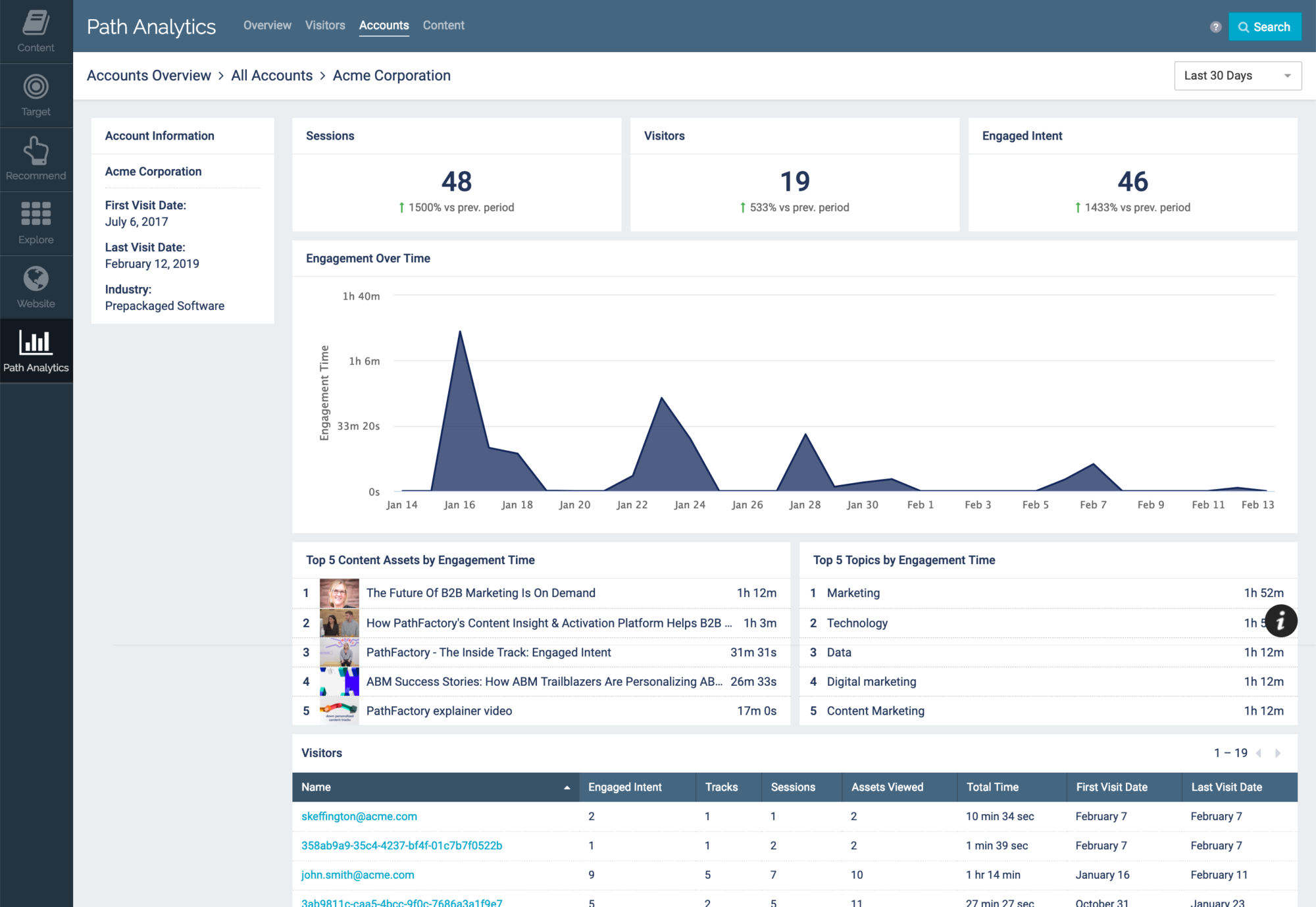 It’s no wonder that revenue teams alike have started to demand better quality, more reliable metrics and greater insight into content consumption. In five years, we predict that all marketers will be focused on the quality of the encounter that individuals or accounts have with their marketing. PathFactory has pioneered this movement and, based on years of experience working with our customers, these new capabilities in our platform tackle B2B’s toughest questions. We’re finally giving marketing and sales clear insight on buyer and account engagement, content and channel performance, and overall marketing impact.
