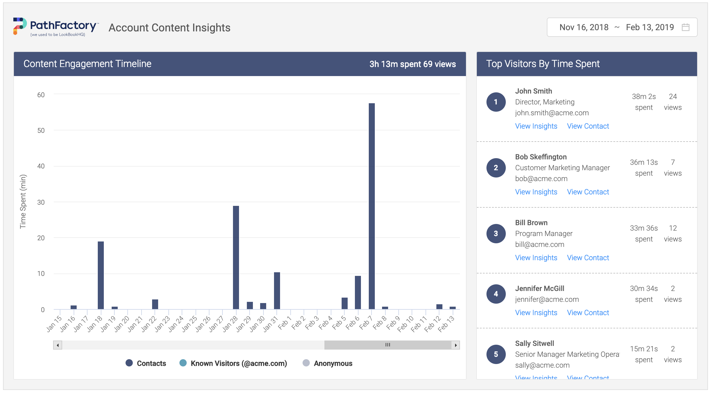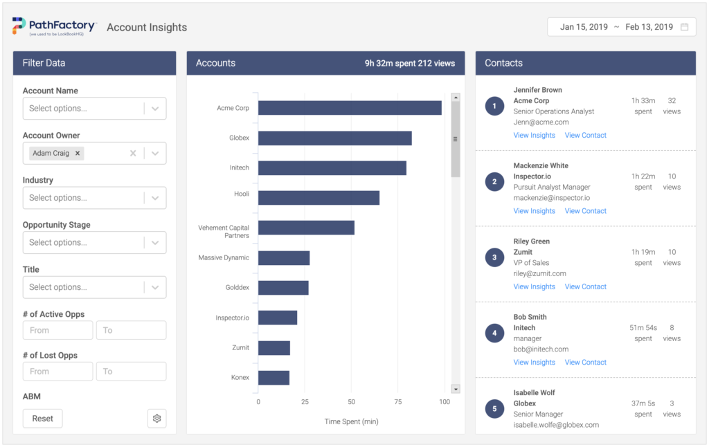 While other solutions may assign “time” to particular binary actions (e.g., 10 minutes for filling out an eBook form), PathFactory measures down-to-the second how much time was spent on your content by an individual. PathFactory also displays this consumption data by account so marketers gain useful insight into the accounts that are the most deeply engaged as well as the people at the account who might make up a buying committee. Trending topics and assets are easily surfaced so you can understand exactly what is resonating with the account.